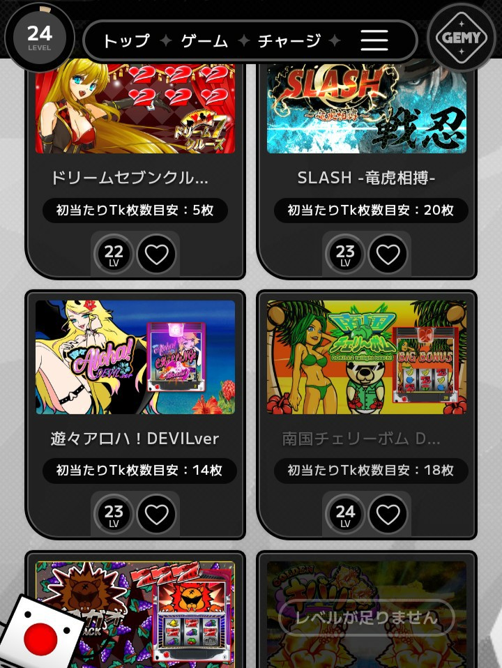 有利会員になると、オンスロサイトは条件無しで全ての設置機種がプレイ出来ますが、GEMYはアカウントのレベルを上げないとプレイ可能な機種が増えないシステムになっています。