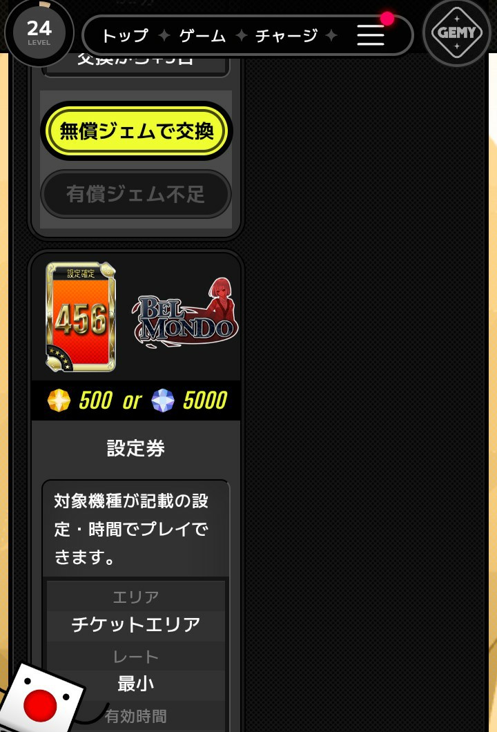 他にもGEMY独自のシステムとして、アカウントのレベルアップで無償ジェムが貰えるのですが、それを設定券に交換することも出来ます。