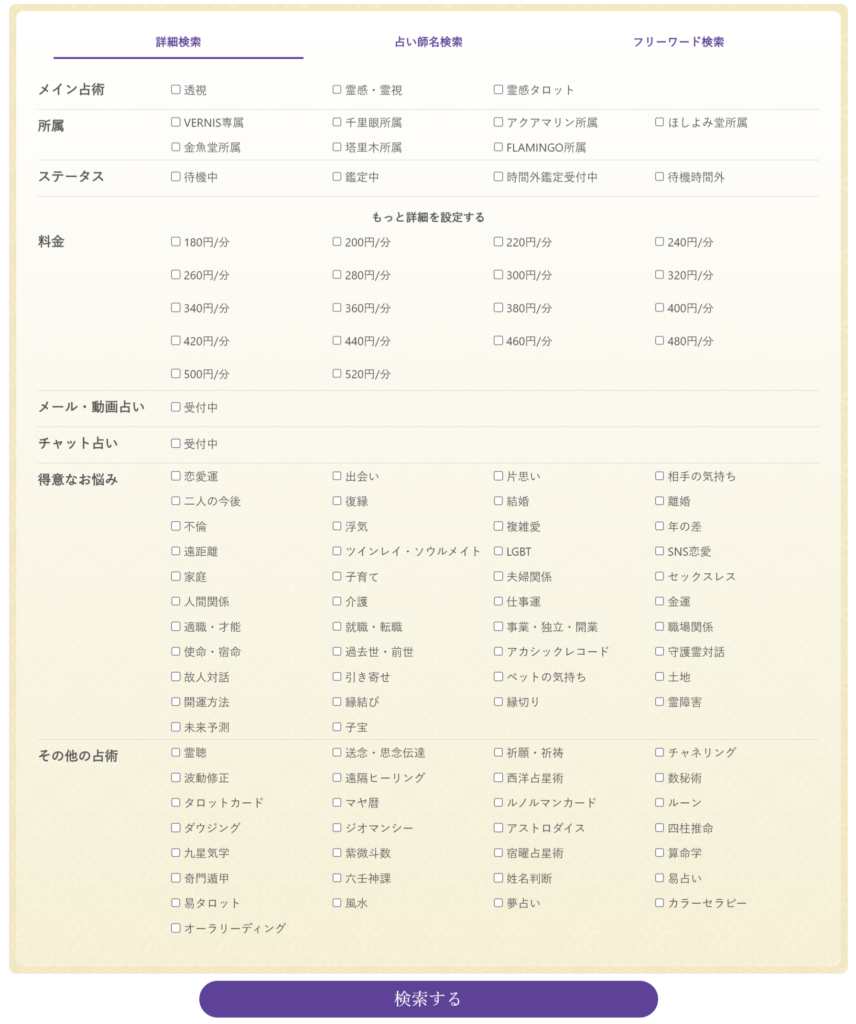 「ヴェルニ」では多数の占い師が在籍しており、どの占い師にお願いしたら良いか迷ってしまいそうですが、検索機能により「占術」「悩みの種類」等の細かな選択をすることが可能です。